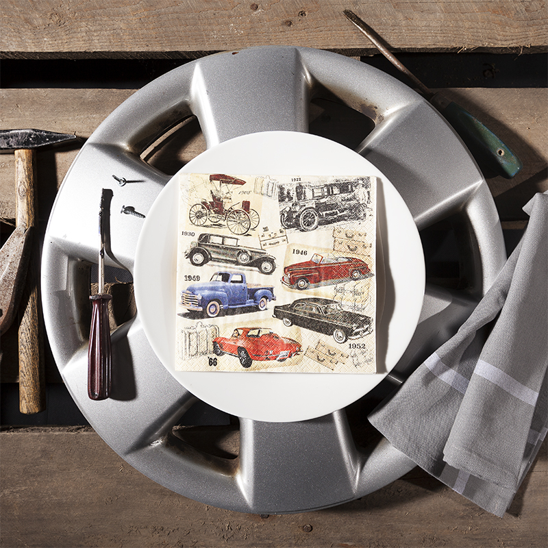 Mit einer Größe von 33 cm x 33 cm und einer 3-lagigen Qualität überzeugen diese Servietten nicht nur durch ihr optisches Highlight, sondern auch durch ihre praktische Handhabung. Sie sind ideal geeignet für ambitionierte Dekorateure, Hausfrauen und Ladeninhaber, die ihren Räumen sowie ihren Festtischen einen dezenten, historischen Touch verleihen möchten. Die sorgfältig ausgewählten Farben und das nostalgische Motiv entführen in eine Ära, in der klassische Automobile und elegantes Design im Vordergrund standen.