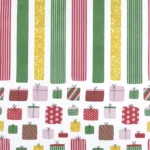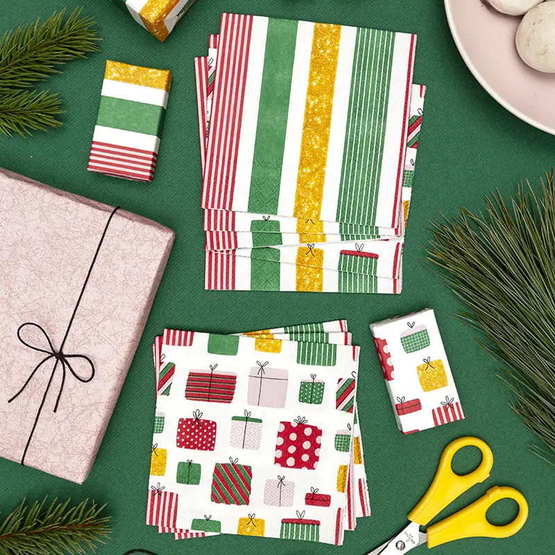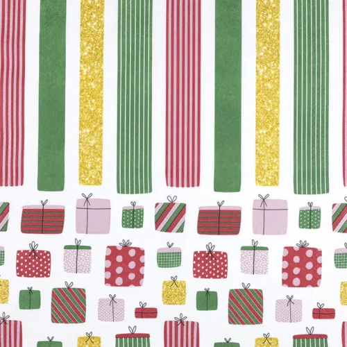 Das grafische Muster, das liebevoll gestaltete Geschenkpakete zeigt, verleiht diesen Servietten einen modernen, verspielten Flair, der durch farbenfrohe Akzente wie Rot, Rosa und Grün bereichert wird. Die goldfarbenen Details runden das Design elegant ab.